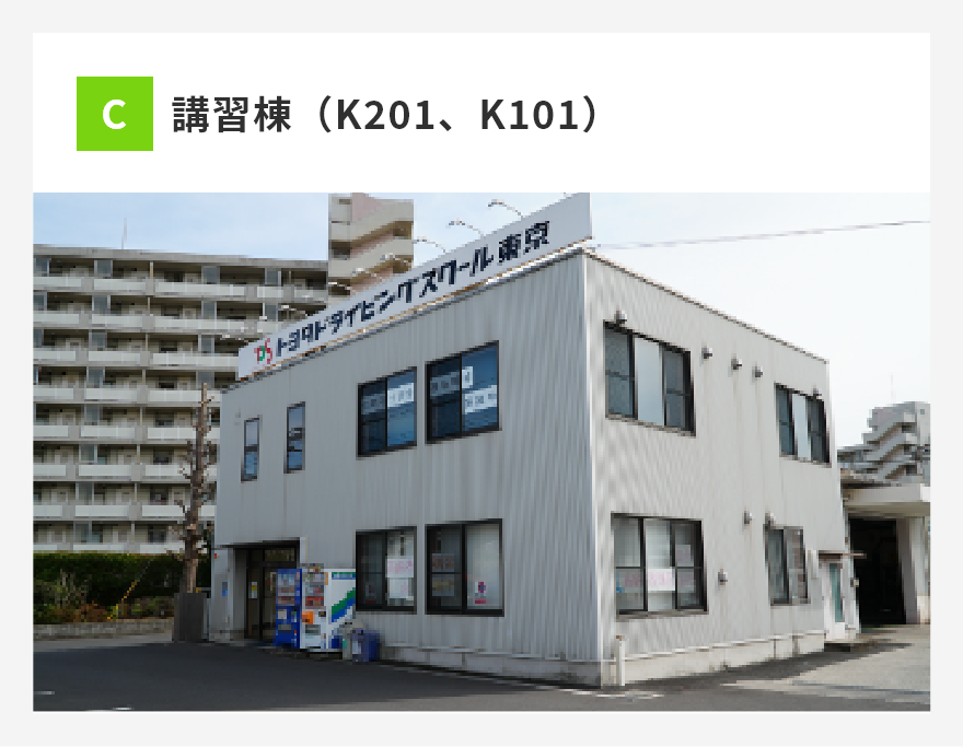 - トヨタドライビングスクール東京の南門付近まで来たら、左折して敷地をぐるっと回るように進んでください。右手側に本館が見えてきます。